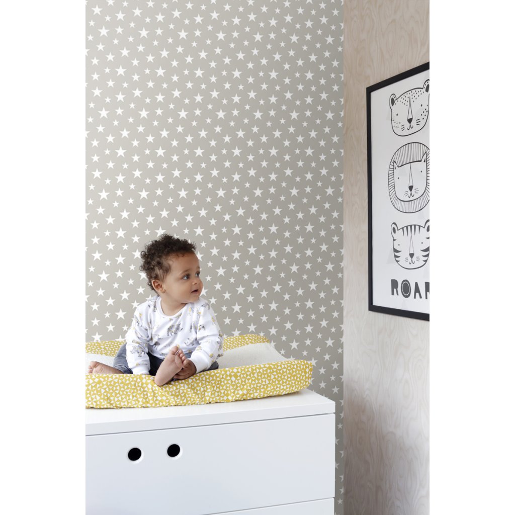 S touto roztomilou tapetou bude váš drobček spať pod hviezdami. Táto fantastická tlač na tapety v teplej šedej farbe je nevyhnutnosťou pre krásny prízvuk a dodáva detskej izbe hrejivú a očarujúcu atmosféru. Sladké sny!