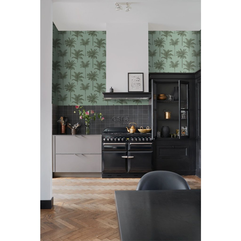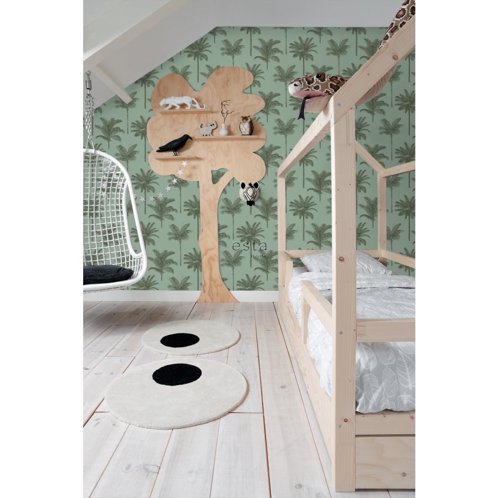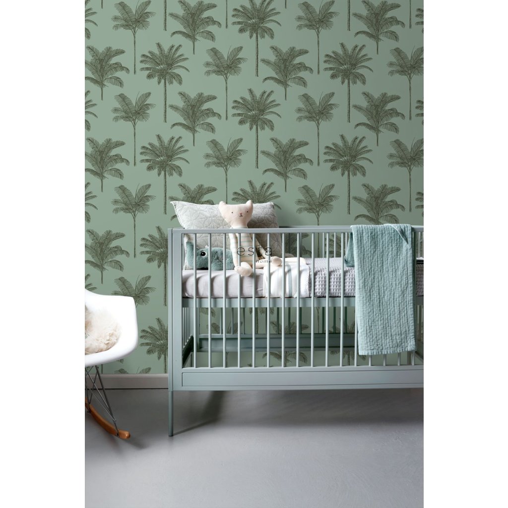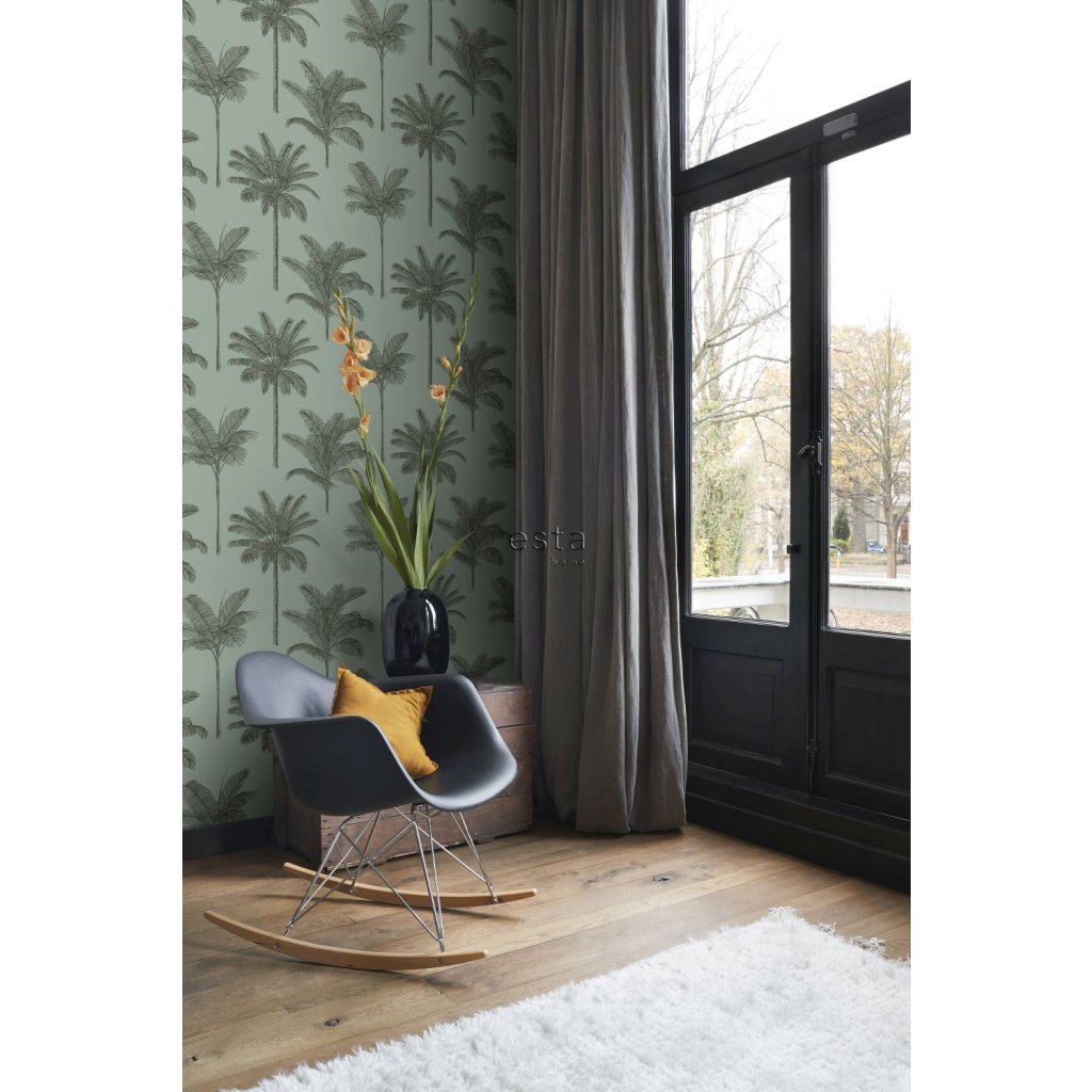 Ozdobte svoje steny touto nádhernou exotickou potlačou s palmami v šedozelenej farbe a vytvorte si vlastnú mestskú džungľu. Tropický botanický vzhľad za použitia prírodných materiálov, kombinácie neutrálnych farieb s odtieňmi zelenej, ako sú olivy, mäty alebo smaragdy, a samozrejme: mnohých rastlín.
