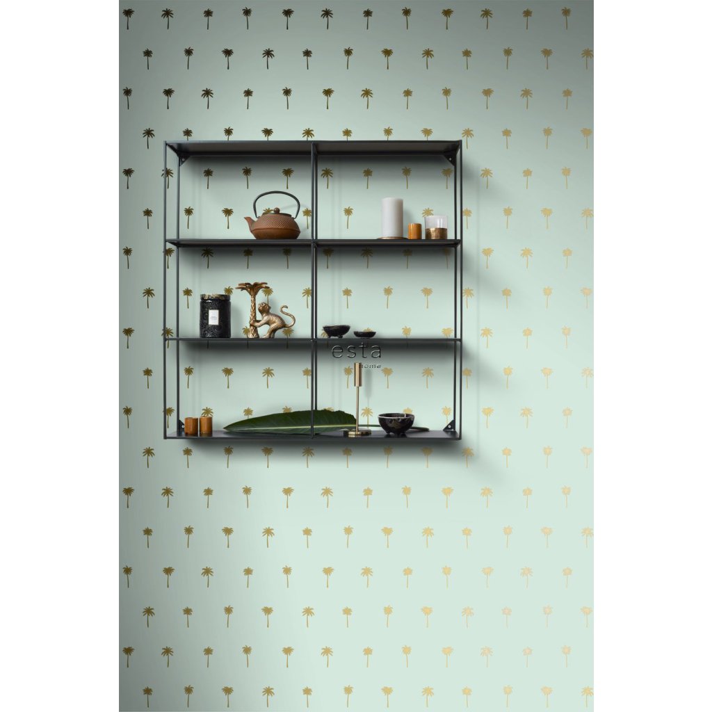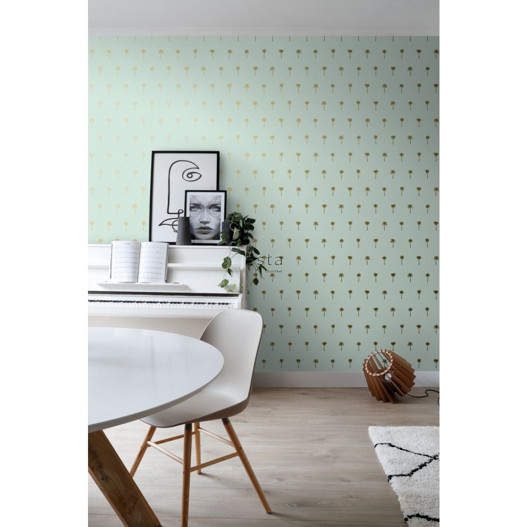Ozdobte svoje steny touto nádhernou exotickou potlačou s palmami v mätovej zelenej a zlatej farbe a vytvorte si vlastnú mestskú džungľu. Dostupná v rôznych farbách.