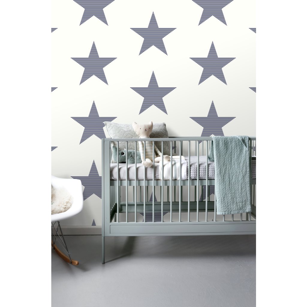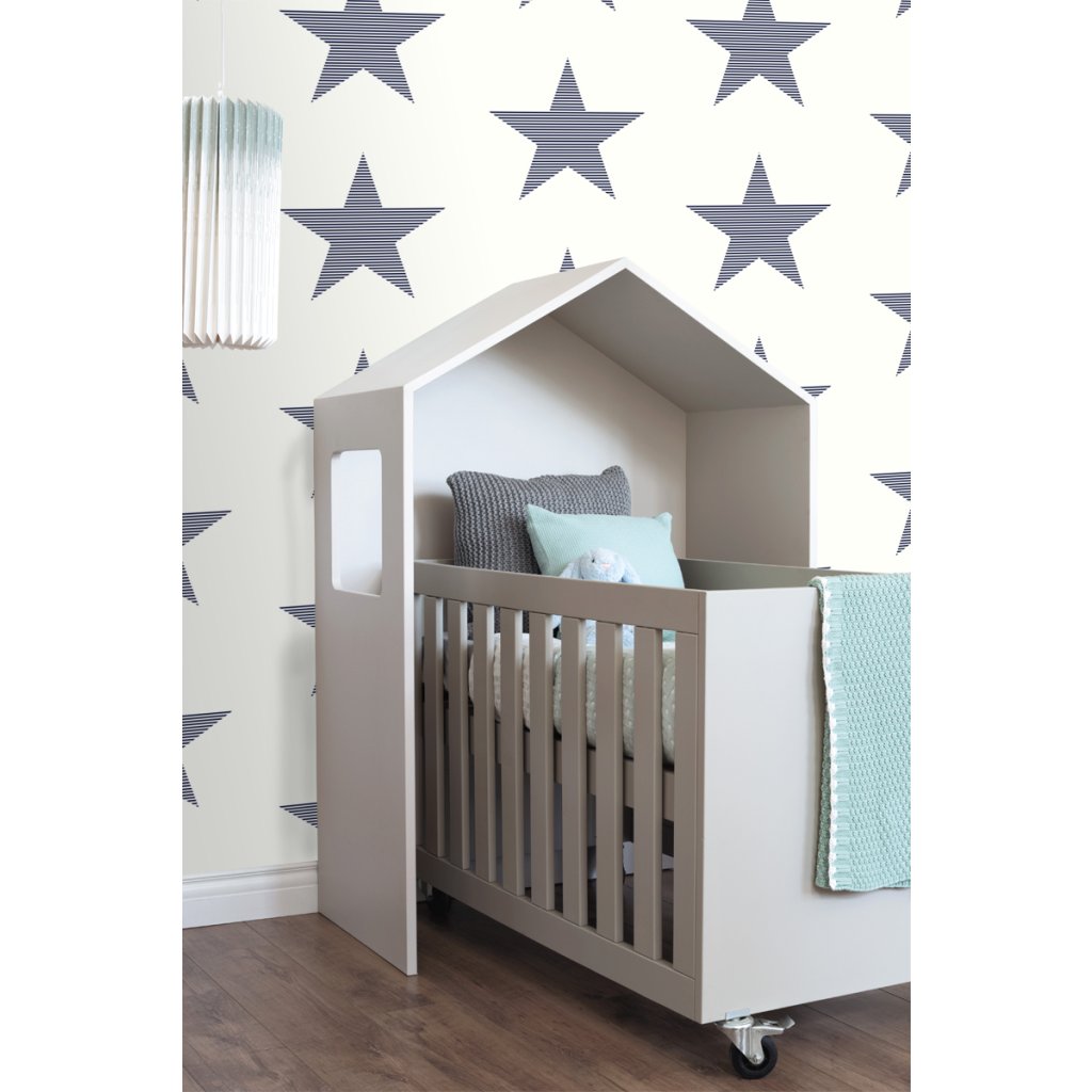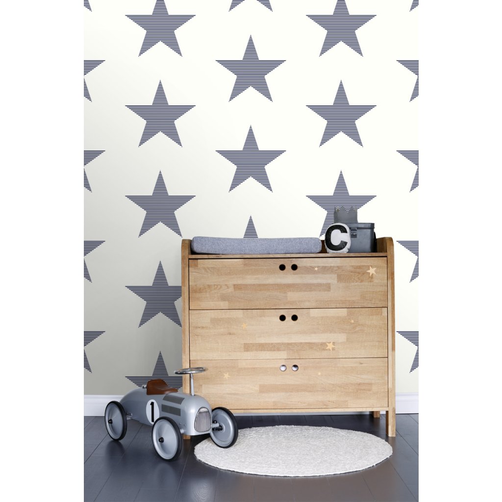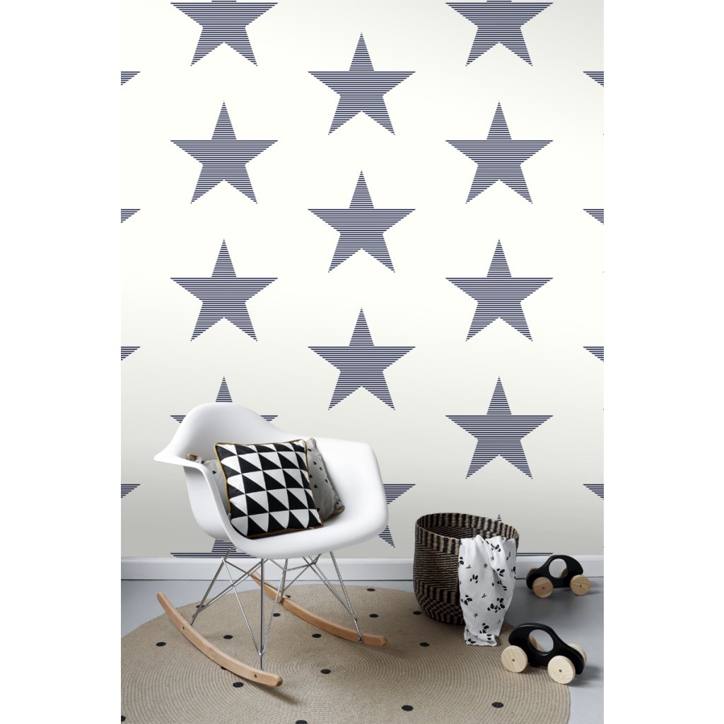 Táto trendová tapeta s pruhovanými hviezdami v tmavomodrej na bielej farbe je ideálna na vytvorenie nápadnej steny s prízvukom a dodáva miestnosti hrejivú atmosféru.
