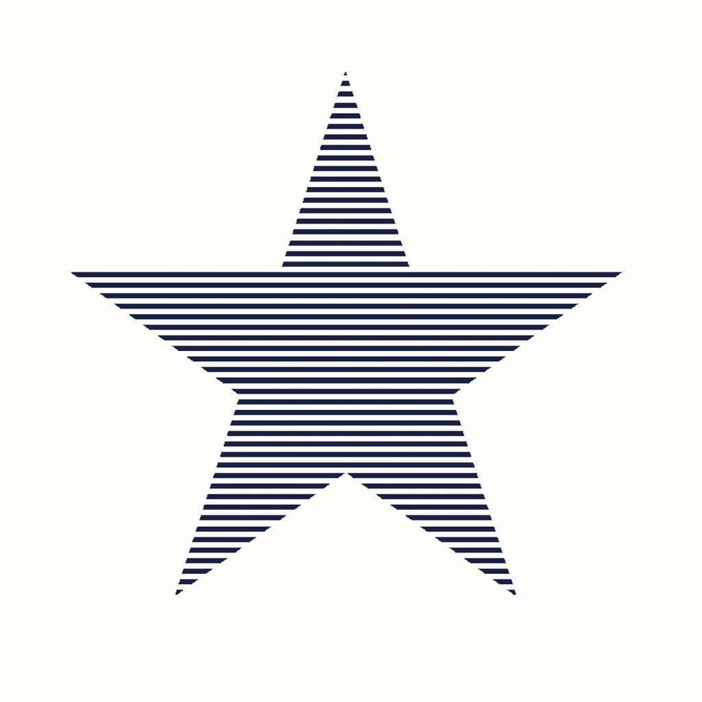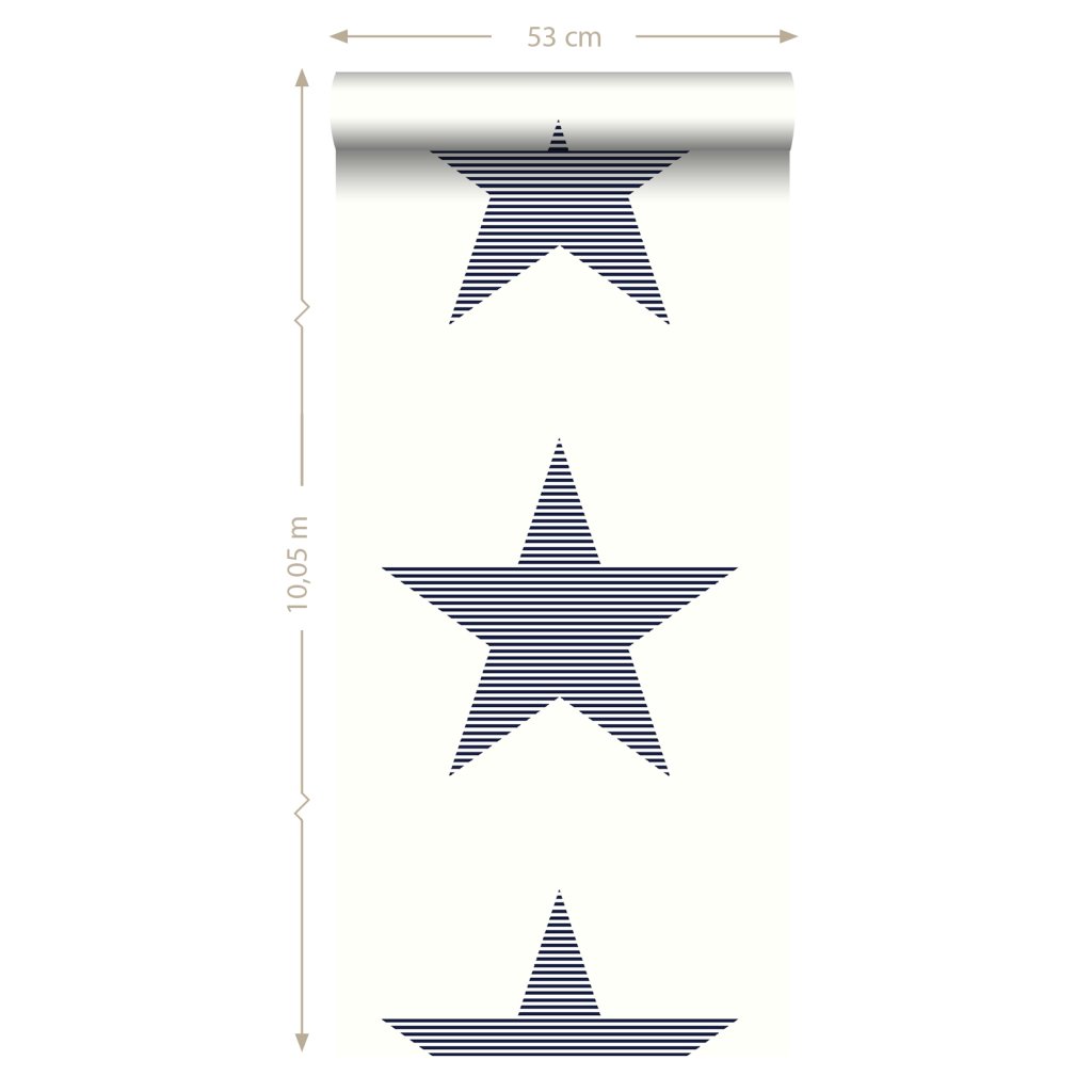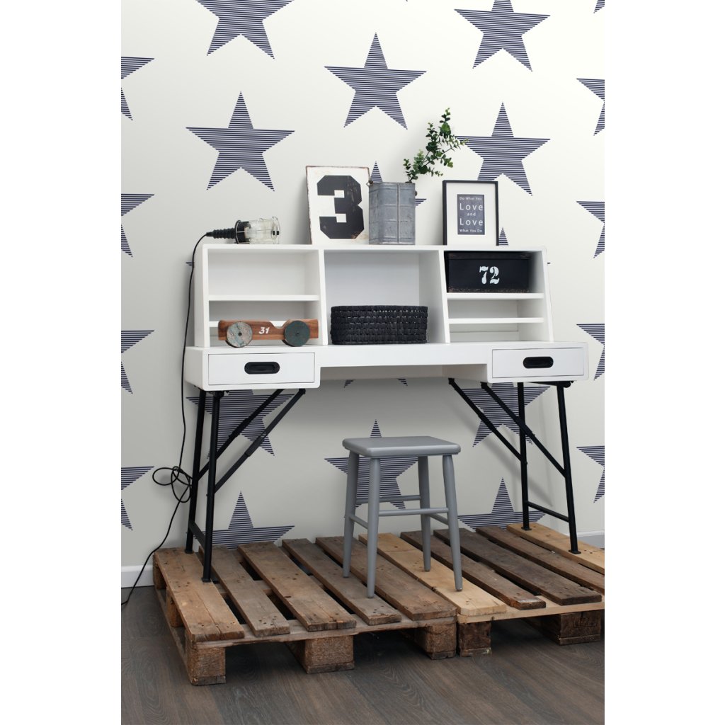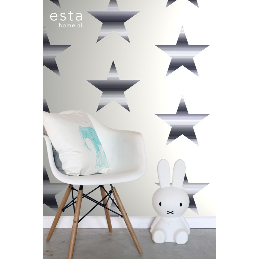 Táto trendová tapeta s pruhovanými hviezdami v tmavomodrej na bielej farbe je ideálna na vytvorenie nápadnej steny s prízvukom a dodáva miestnosti hrejivú atmosféru.