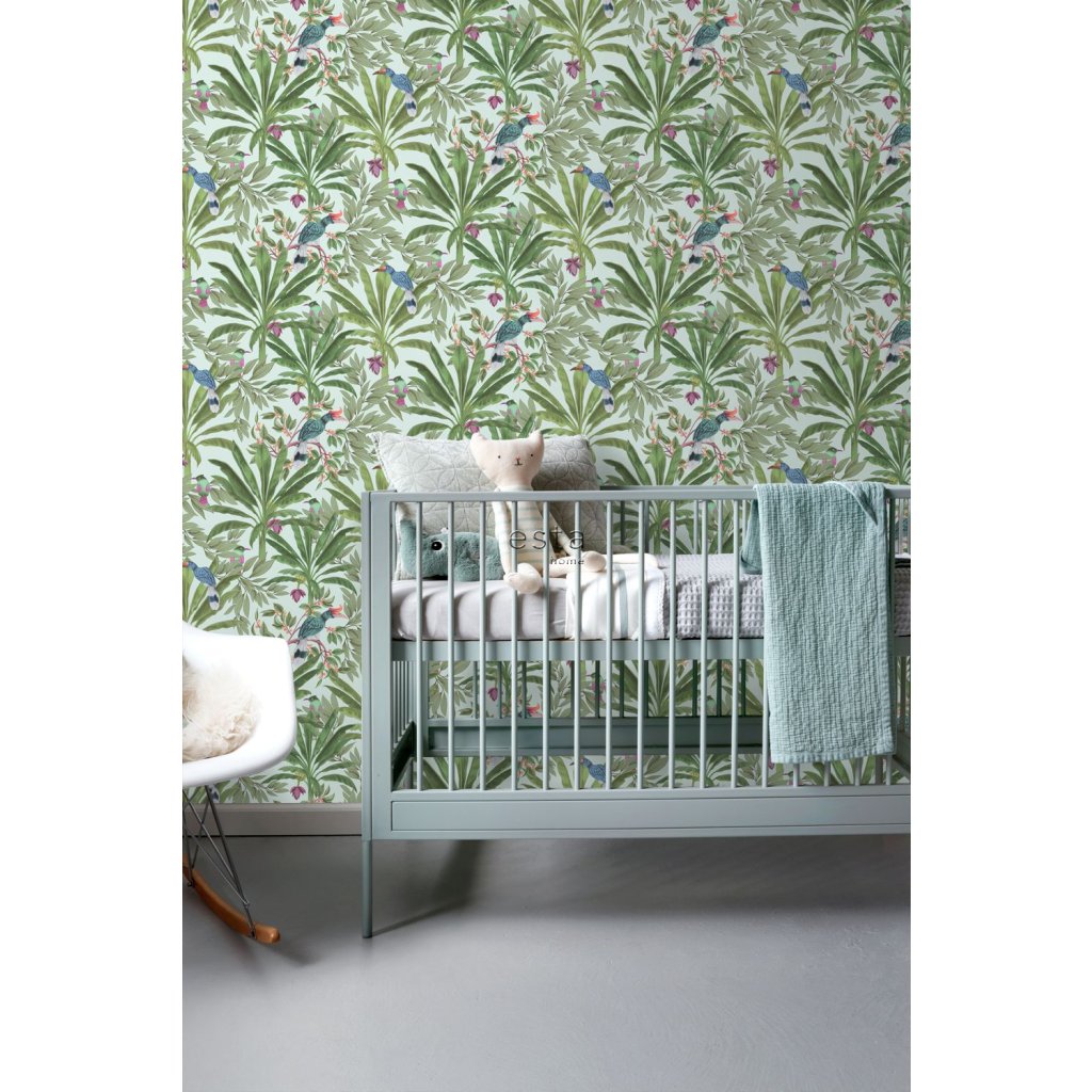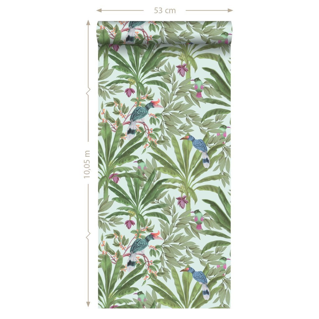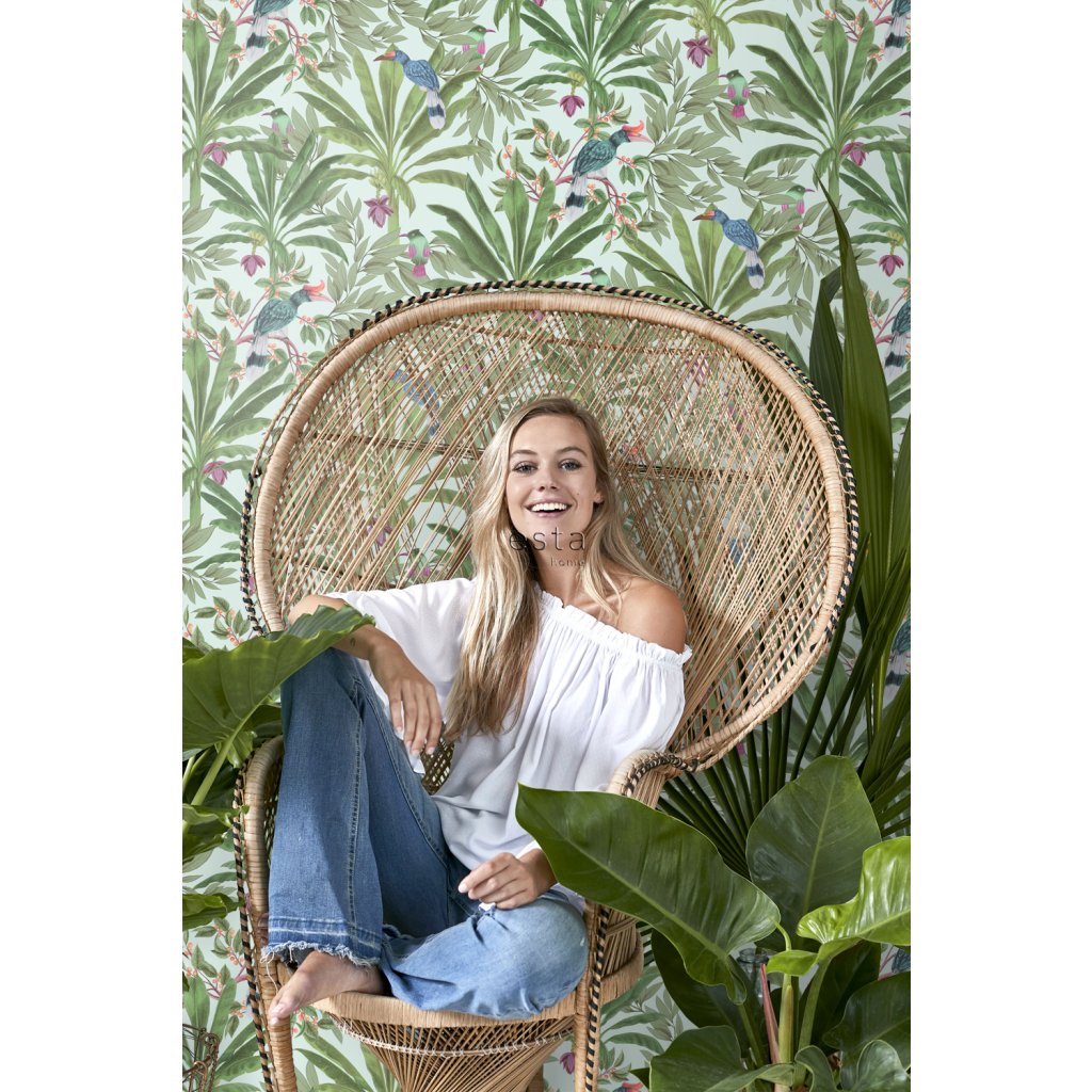 Ozdobte svoje steny touto nádhernou exotickou potlačou s tropickými listami džungle a rajskými vtákmi a vytvorte si vlastnú mestskú džungľu. Táto tapeta je ideálna na vytvorenie steny s prvkami a dodáva vašej miestnosti živú, veselú a tropickú atmosféru. Dostupná v rôznych farbách.