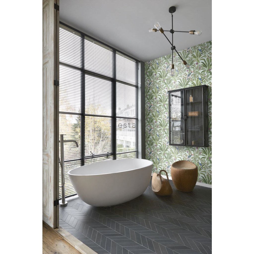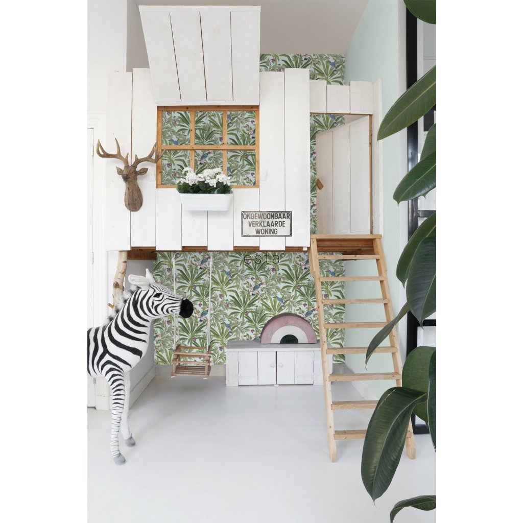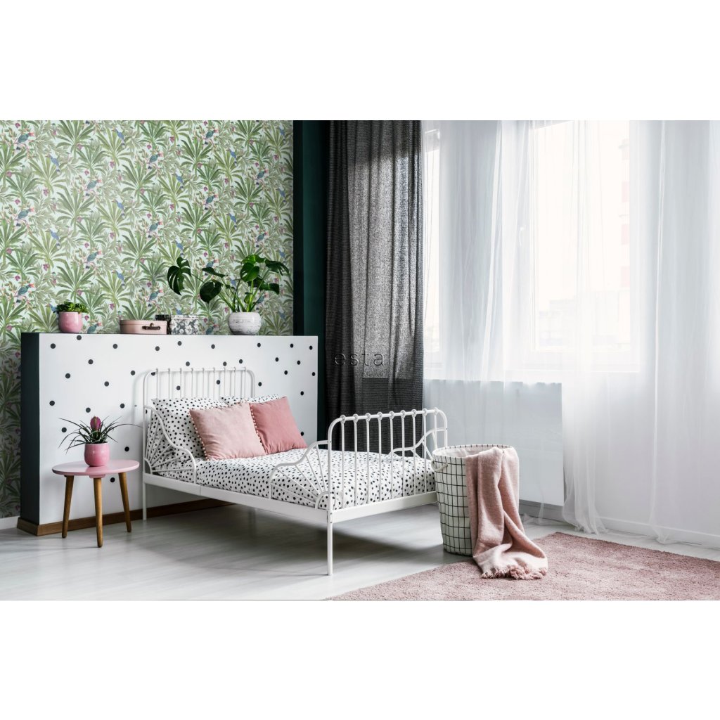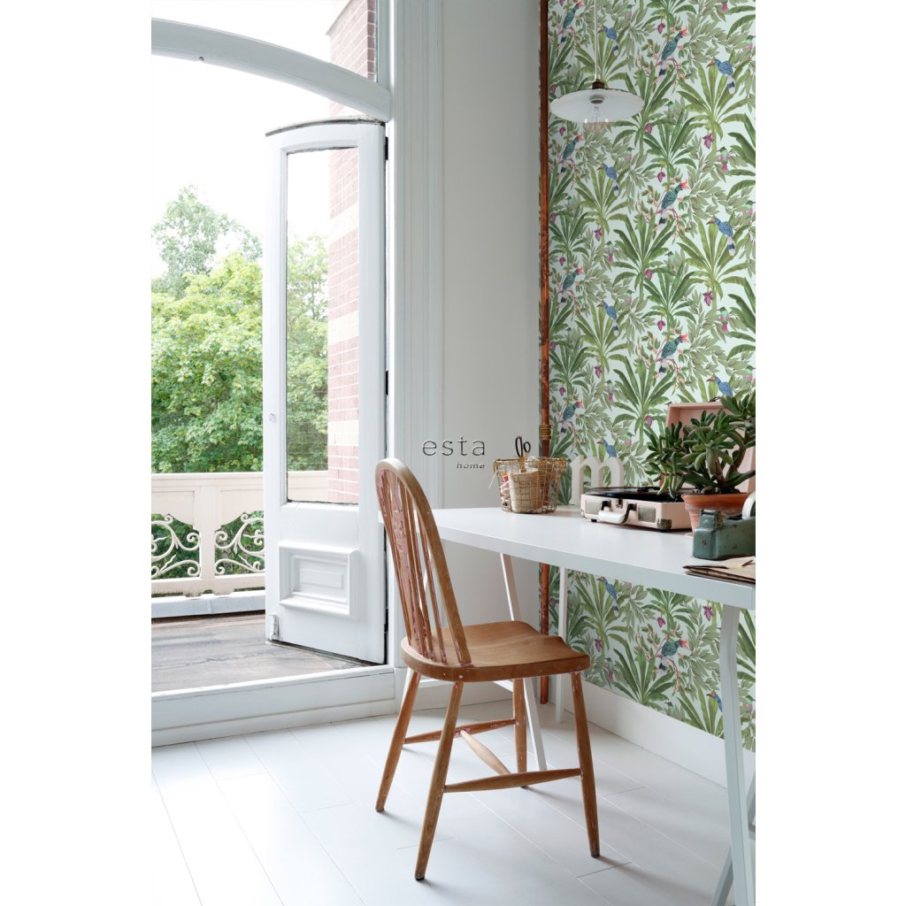 Ozdobte svoje steny touto nádhernou exotickou potlačou s tropickými listami džungle a rajskými vtákmi a vytvorte si vlastnú mestskú džungľu. Táto tapeta je ideálna na vytvorenie steny s prvkami a dodáva vašej miestnosti živú, veselú a tropickú atmosféru. Dostupná v rôznych farbách.